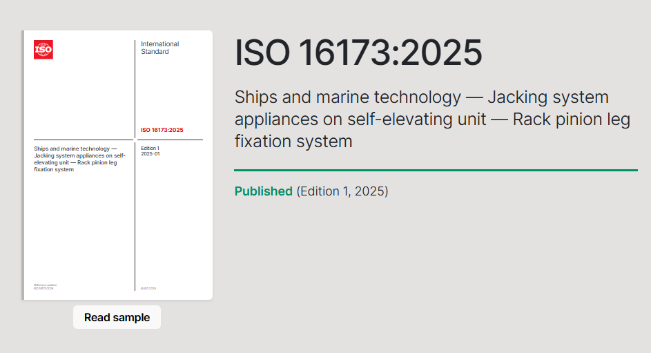 2025年1月,由廣東精銦海洋工程股份有限公司主導(dǎo)編制,聯(lián)合中國船舶工業(yè)綜合技術(shù)經(jīng)濟研究院、中國船級社和中山大學(xué)共同參與的ISO 16173:2025《船舶與海洋技術(shù)自升式海洋平臺升降系統(tǒng)齒條式樁腿鎖緊裝置》國際標(biāo)準(zhǔn)正式發(fā)布。