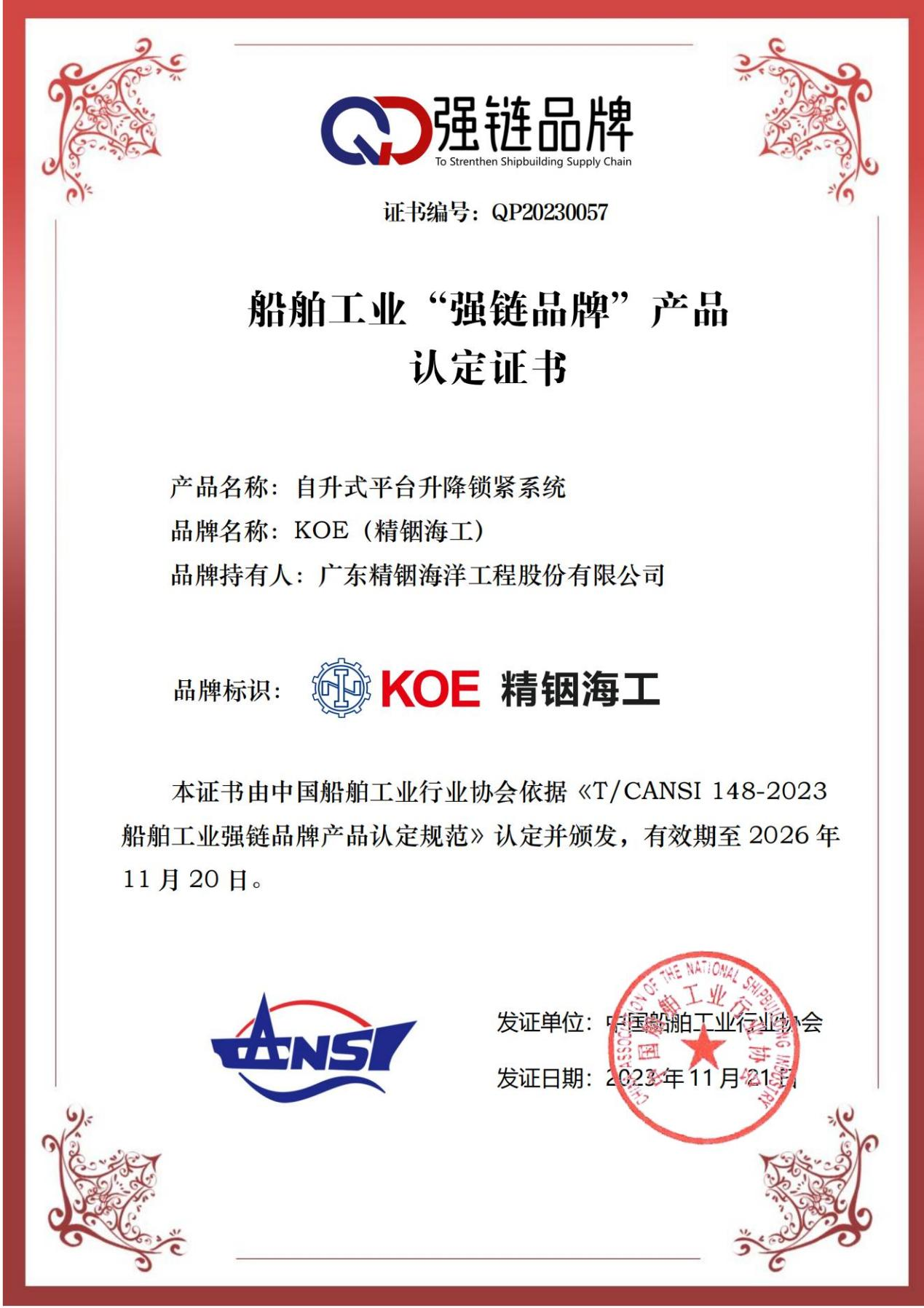 經(jīng)中國(guó)船舶工業(yè)行業(yè)協(xié)會(huì)的專(zhuān)家評(píng)審,精銦海工的“自升式平臺(tái)升降鎖緊系統(tǒng)”成功入選船舶工業(yè)“強(qiáng)鏈品牌”產(chǎn)品目錄,產(chǎn)品的卓越性能和可靠性再次得到了權(quán)威認(rèn)可,彰顯了精銦海工在船舶工業(yè)領(lǐng)域的競(jìng)爭(zhēng)力和影響力。