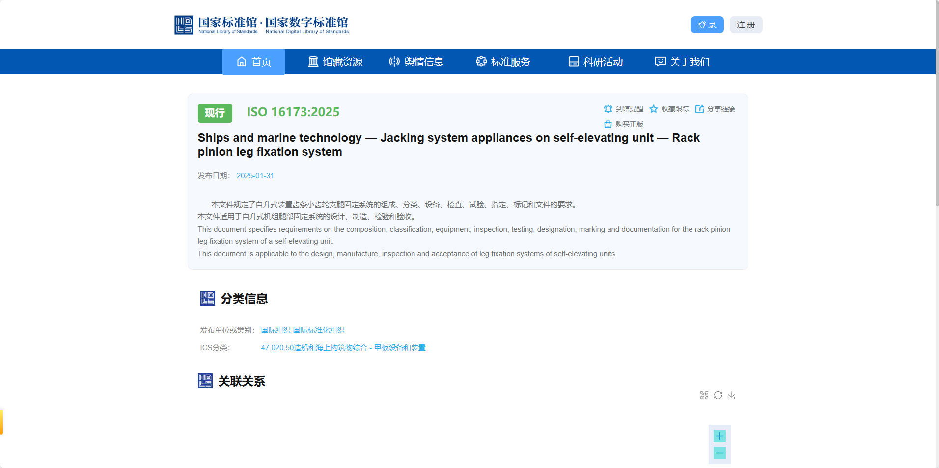 2025年1月,由廣東精銦海洋工程股份有限公司主導(dǎo)編制,聯(lián)合中國船舶工業(yè)綜合技術(shù)經(jīng)濟研究院、中國船級社和中山大學(xué)共同參與的ISO 16173:2025《船舶與海洋技術(shù)自升式海洋平臺升降系統(tǒng)齒條式樁腿鎖緊裝置》國際標(biāo)準(zhǔn)正式發(fā)布。